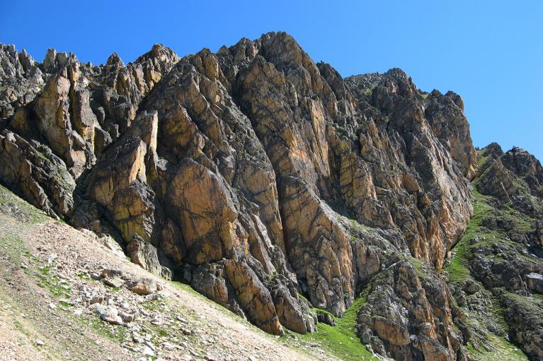 Le sommet n'est donc plus très loin, on distingue et l'on suit le sentier qui serpente dans la rocaille de ce paysage lunaire et, peu avant l'arrivée au col, un passage nécessite de se servir de ses mains autant les jambes, mais il n'est pas très long et après quelques peites acrobaties, nous voici arrivés au col. Certains aimeraient bien qu'une main courante soit installée et qui serait assez utile, surtout pour le retour.