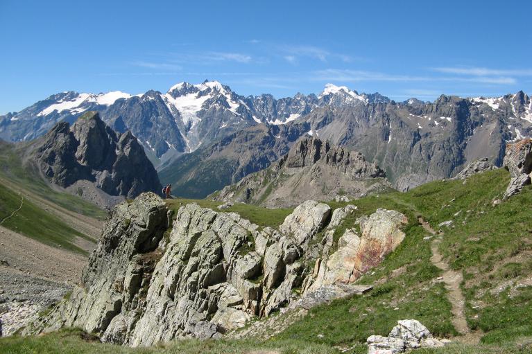 Une fois au col de la Ponsonnière, suivre le sentier s'élevant sur la gauche qui, un peu raide au début, se transforme vite en un sympathique sentier balcon qui surplombe la haute Guisane. On progresse très facilement sur ce sentier (GR 57) avec le regard rivé sur le parcours que l'on découvre; le grand lac, Roche Colombe, les arêtes de la Bruyère, la tête de Cassille, sans parler des sommets archi connus qui trônent à l'arrière.