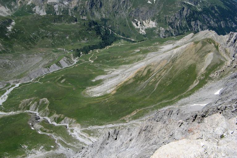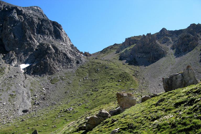 Du col, face au sentier qui mène a Bardonnechia, avec à gauche le Grand Argentier (ne pas prendre le sentier du Petit col de la Roue que l'on aperçoit immédiatement depuis le col, mais suivre un moment celui qui le contourne) et à droite vue sur la cime de Planette et les pointes Balthazar, Melchior, Gaspard.