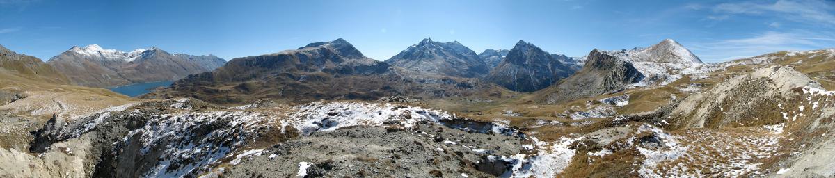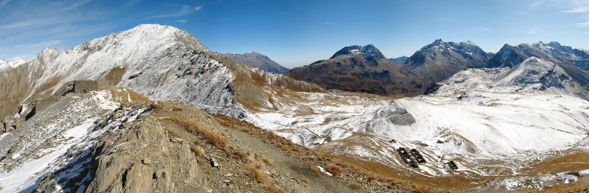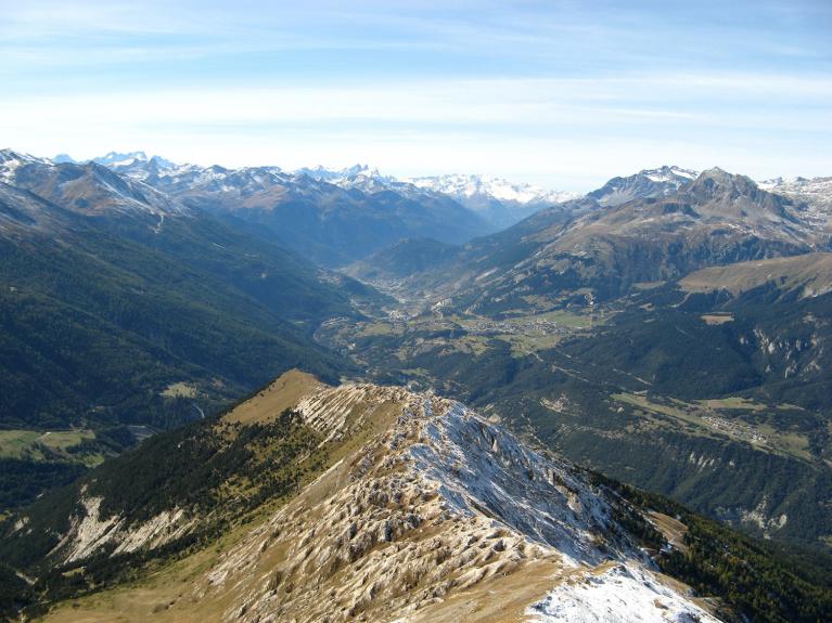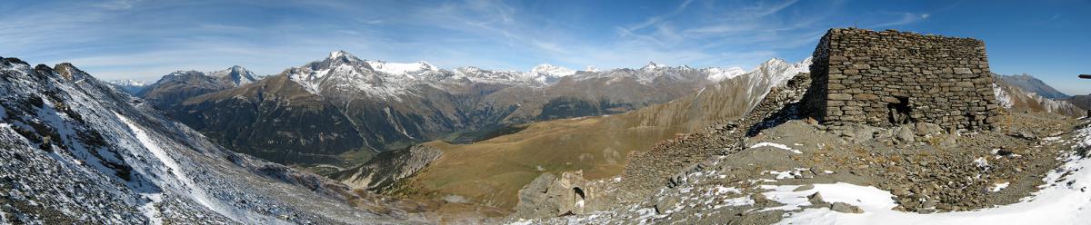 Le Mont Froid est maintenant atteint et avant de s'attarder sur les ruines et leur histoire sanglante, nous sommes saisis par le panorama offert où la vue porte très loin sur la vallée de la Maurienne, au delà de Modane, puis sur les sommets du parc de la Vanoise, avec entre autres; le Rateau d'Aussois, la Dent Parrachée, les glaciers de la Vanoise, la grande Casse etc...car c'est un 360° magnifique (comme toujours).