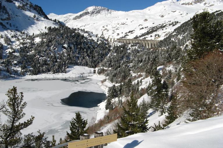 Sur la rive droite du torrent la dépression est beaucoup plus large. Là a été édifié un barrage-poids fait d'un parement de pierres taillées à l'amont avec un léger fruit. A l'aval, parements lisses en béton avec un fruit très accentué. Ce barrage a une forme parabolique. Il est traversé de part d'une galerie de visite dans laquelle divers appareils permettent de suivre les déformations dues à la température, à la pression de l'eau. La longueur du lac est d'environ 900 m et sa largeur de 250 m. La capacité de la retenue est de 3 900 000 m 3 : elle est alimentée d'une part par les eaux du ruisseau de Saint-Benoit après leurs passages dans le Plan d'Amont, d'autre part, par la galerie souterraine de 16,8 km de longueur conduisant depuis Entre Deux Eaux, les eaux du Doron de Termignon et captant au passage tous les torrents du versant Sud du Massif de la Vanoise. Le Plan d'Aval alimente la Centrale d'Aussois construite 900 m plus bas, au fond de la vallée de l'Arc, près d'Avrieux. De nos jours, le Plan d'Aval est totalement intégré au complexe hydroélectrique de la Haute Maurienne : il participe au remplissage du lac du Mont-Cenis au début de saison.