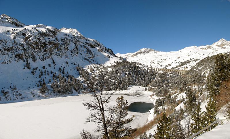 Le départ se situe au pied des pistes d'Aussois, en bout du grand parking, qui est la limite de la circulation, car la route que nous suivons l'été pour nous rendre jusqu'aux barrages est fermée en cette période et sert de piste de ski fréquentée principalement par les skieurs qui débutent ou qui apprécient les pentes douces.