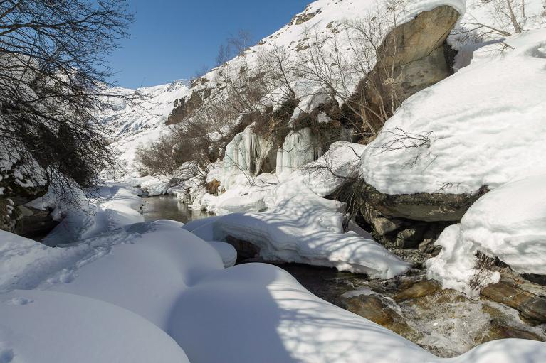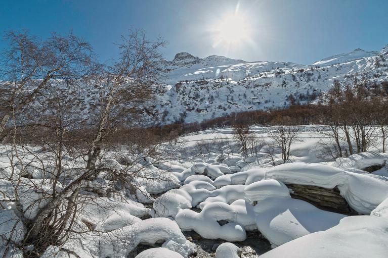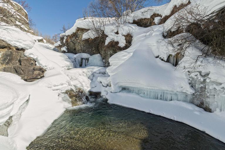 Je me suis arrêté à l'Écot, mais il est évident qu'après le hameau, en direction de la Duis par exemple, la randonnée peut se poursuivre toujours dans un superbe décor. De retour au pont de la Lama, le traverser et prendre au bout à droite avant la route qui est transformée en piste de ski, passer dessous en suivant les traces que, pour ma part j'ai trouvé déjà toutes faites et qui permettent d'être au plus près de l'eau, les pieds sur un sentier bien damé, avec l'eau qui coule et des sculptures naturelles de glace tout autour.