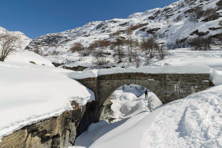 À peine après avoir fait les premiers pas, l'appareil photo est déjà en action ; Le pont de la Lama est assez vite en vue et pour le retour il faudra le traverser pour s'approcher du lit de l'Arc comme prévu. Pour l'instant, continuer tout droit et peu de temps après le hameau de l'Écot est en vue.
