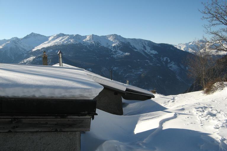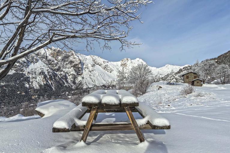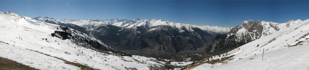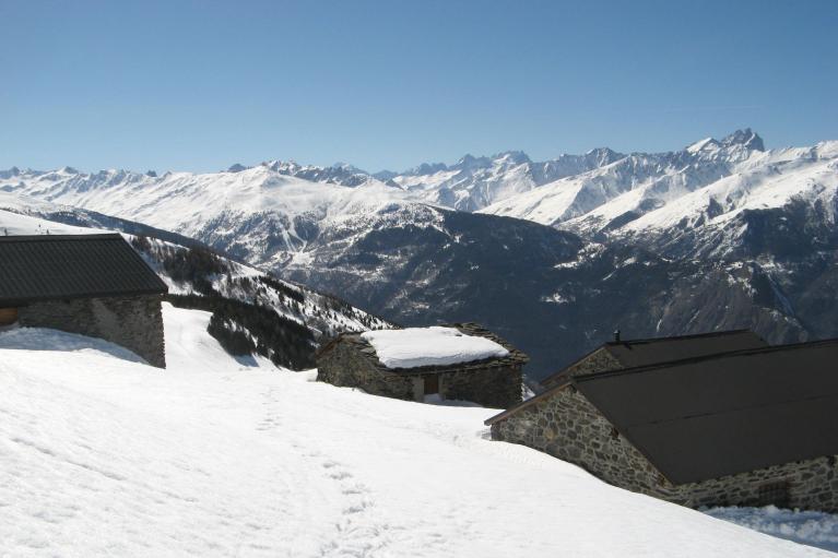 Contourner les chalets par la droite où se trouve une table de pique nique afin d'apprécier le panorama qui se découvre et vous pourrez voir; le Perron des Encombres, le col du Bonhomme, la Croix tes Têtes, les stations de la Toussuire et du Corbier, les karellis, Valloire-Valmeinier et bien sûr les Aiguilles d'Arves.