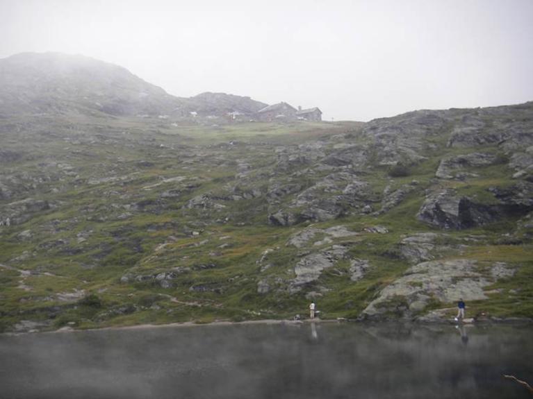 Le toit que nous apercevons est celui du refuge du Lac blanc. Tout autour du lac des pêcheurs, alors ne faisons pas de bruit.