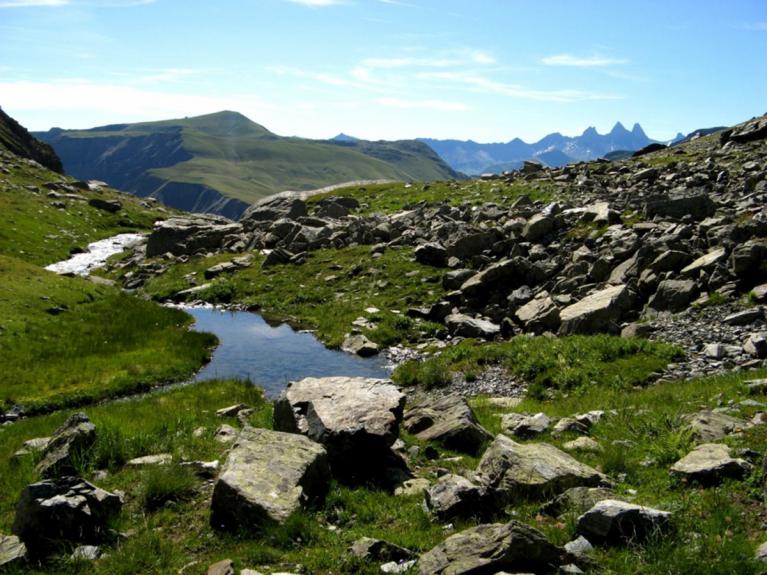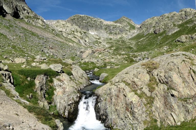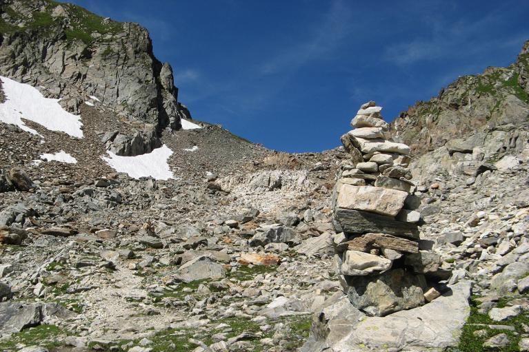 A l'approche du torrent, le sentier continue encore un moment dans un dénivelé très doux et se transfome en pierrier qui se franchit cependant bien, avec la présence de nombreux cairns présents afin de vous aider à rester sur la bonne direction.