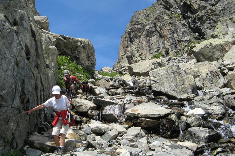A partir du parking, on aperçoit le sentier qui démarre en pente très douce, descend un peu puis, remonte en contournant les Aiguil- les de l'Argentière par la droite.