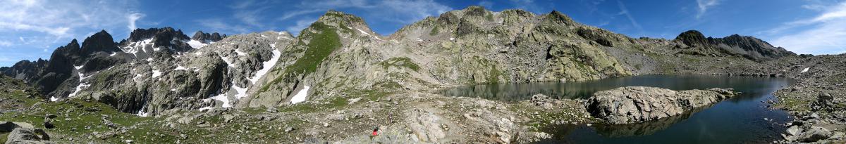 L'arrivée au lac de la Croix - vue sur le but du jour, le col de la Croix et le panorama d'ensemble avec les Aiguilles de l'Argentièreau dessus.