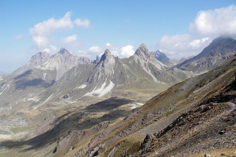 Le col de la Ponsonnière avec la crête du même nom. Le chemin que l'on voit sur la photo permet de rejoindre le Grand Galibier, mais le ciel d'aujourd'hui nous incite à continuer la ballade comme expliqué plus haut.