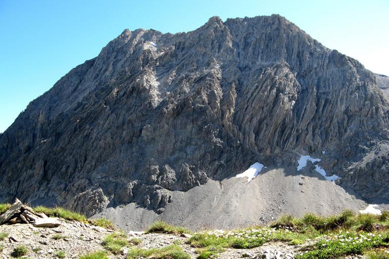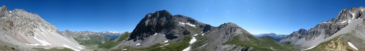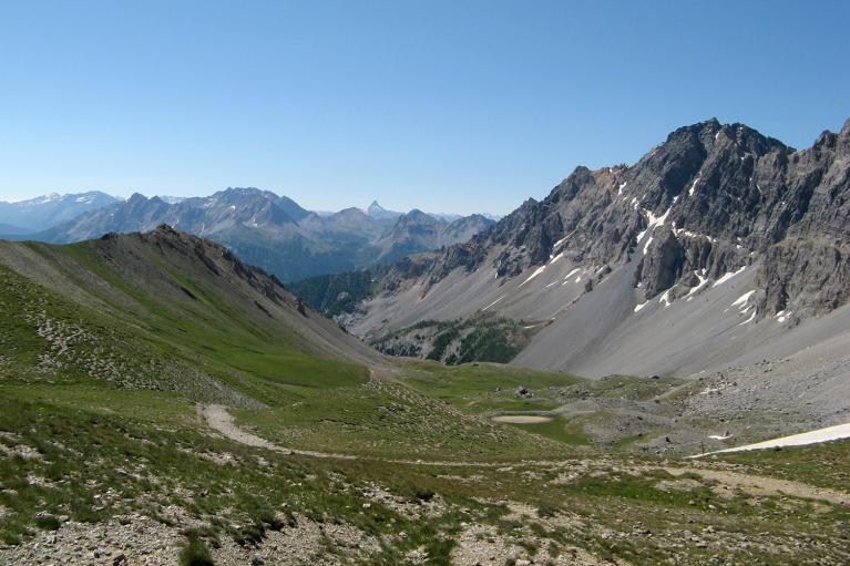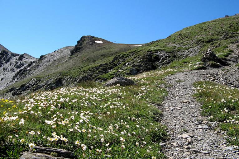 Proche du sommet, cette vue d'ensemble du chemin parcouru vous donne un aperçu du dénivelé raisonnable dont je vous parlais. Sur la partie toute en verdure à droite de la photo, on peut distinguer le sentier qui mène au Petit Argentier et à gauche, le sentier continue en direction du col de Vallée Etroite et du refuge du Thabor. Quand au sujet qui nous concerne, il suffit de se retourner et de gravir les quelques centaines de mètres qu'il reste à accomplir.