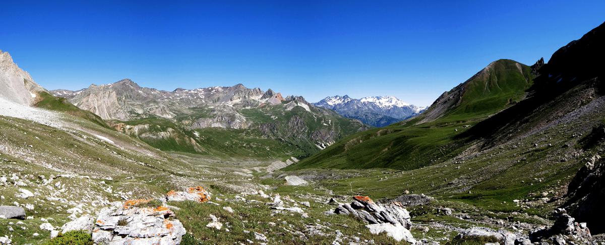 Après avoir laissé la piste qui mène au Pas du Roc, au col du Fréjus (entre autres) et dont je vous reparlerai prochainement à l'occasion de la rando du tour du Grand Argentier, suivre le vallon de la Roue et cet alléchant panorama (merci, c'est moi qui l'ait fait) donne l'occasion d'apprécier le magnifique paysage, avec la cime de la Planette, le col et la pointe des Sarrasins, le roc Rouge, les chalets de Fontaine Froide.