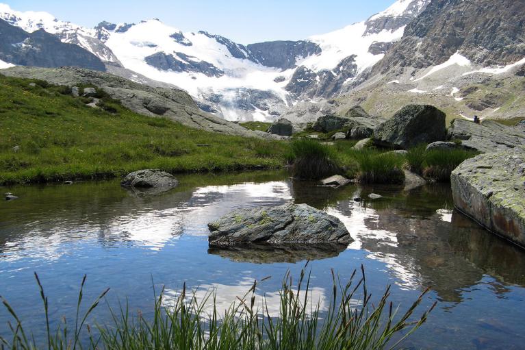 Le glacier des Evettes possède le plan des eaux le plus riche et complexe des Alpes occidentales .Un réseau confus d'eaux courantes et dormantes a valu au glacier son nom : evettes, diminutif de "éve", eau.