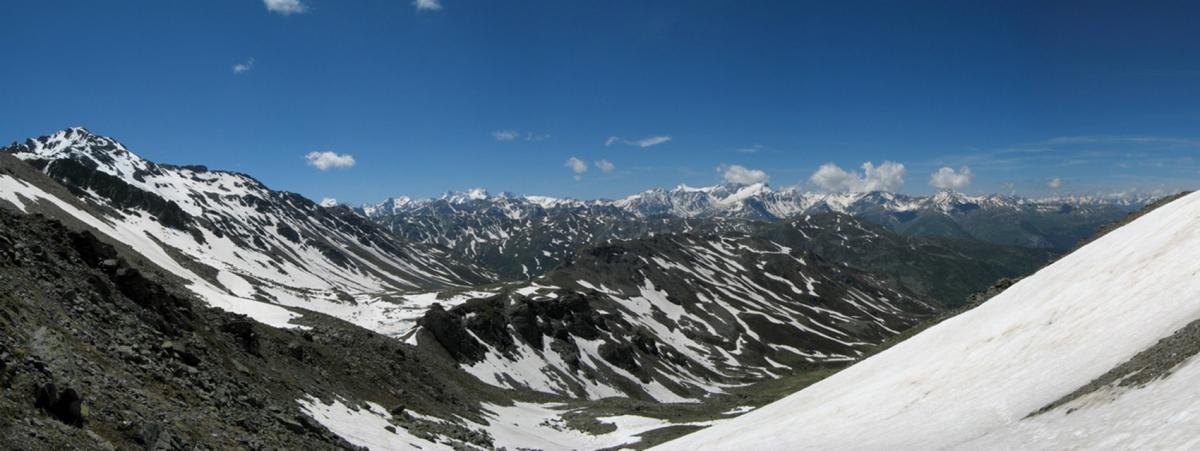 Sur le panorama du dessus, on aperçoit ; le lac de Roche Noire qui n'est pas encore entièrement découvert, le dôme des Ecrins, la Meije, quelques nuages recouvrant les Aiguilles d'Arves, les pistes de ski de Valmeinier (côté Armera).