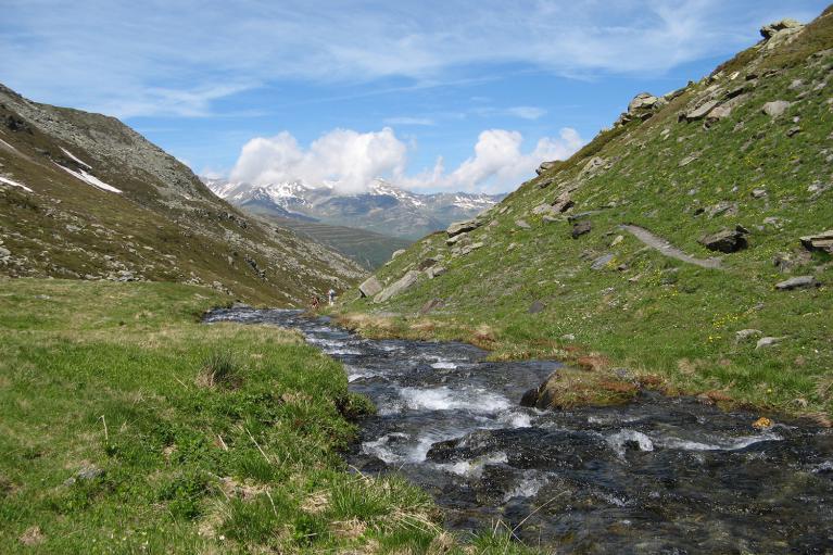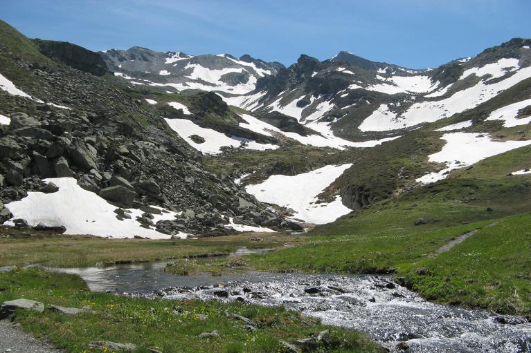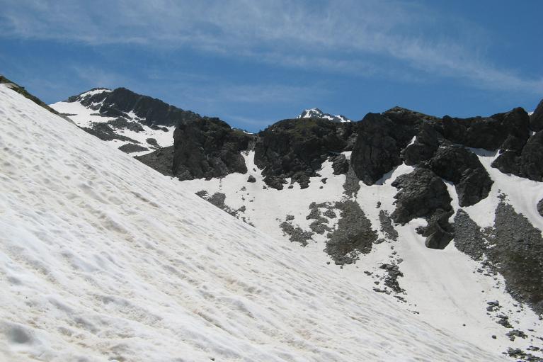 Après avoir traversé le ruisseau, le dénivelé devient tout de suite plus important et le sentier est fréquement coupé par des névés plus ou moins imposants. Donc la progression devient plus lente mais réalisable sans problème.