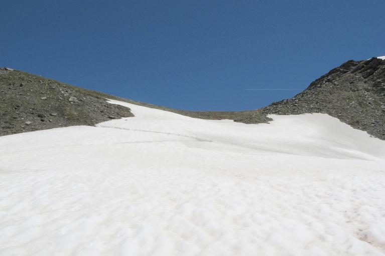 Plus on monte, plus le dénivelé s'accentue, me voici sur un joli névé à traverser et prendre une photo est un bon pretexte pour reprendre son souffle.