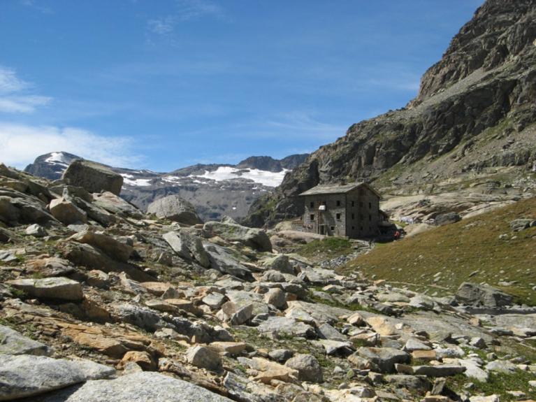 Au col des Pariotes, avec à gauche une vue sur le glacier des Sources de l'Arc, au centre, l'Ouille des Pariotes (3123m), la suite se passera en redescendant par la droite sur le refuge du Carro en se tenant au plus près de l'Ouille, d'où l'on ne tarde pas à apercevoir le refuge au loin.
