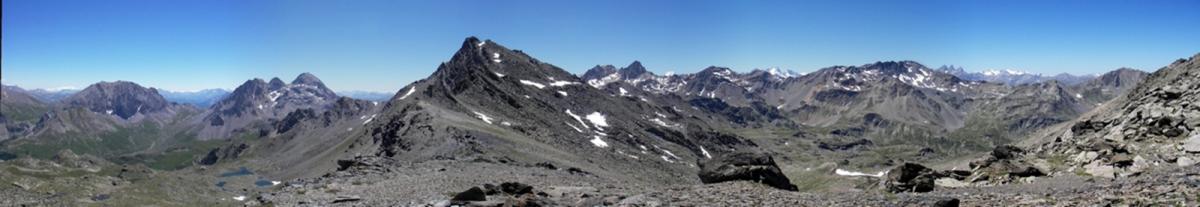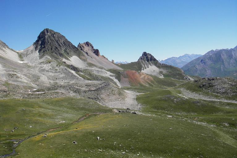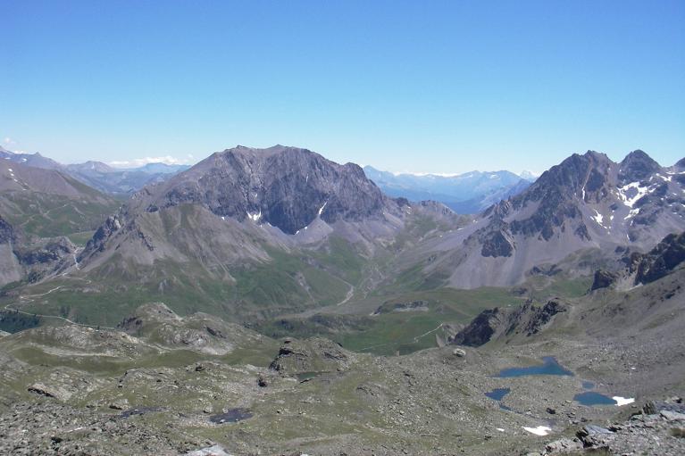 Arrivée au col après une montée assez raide, vue sur le Pas du Roc à g., le Grand Argentier et on devine le col de la Roue.