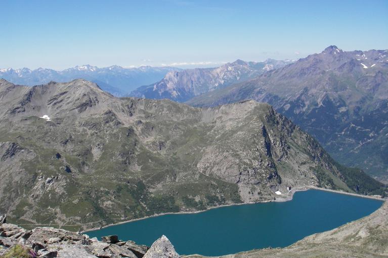 Un regard en arrière permet de voir le chalet que nous avons longé, la prise d'eau de la Losa puis au fond les pistes de ski de Valfréjus. Puis après avoir longé le ruisseau des Sarrasins, nous voici arrivés aux deux petits lacs