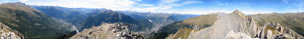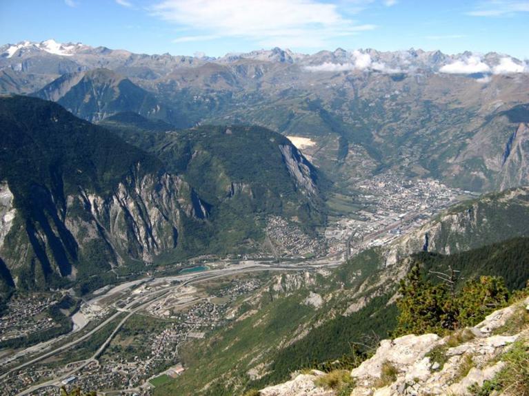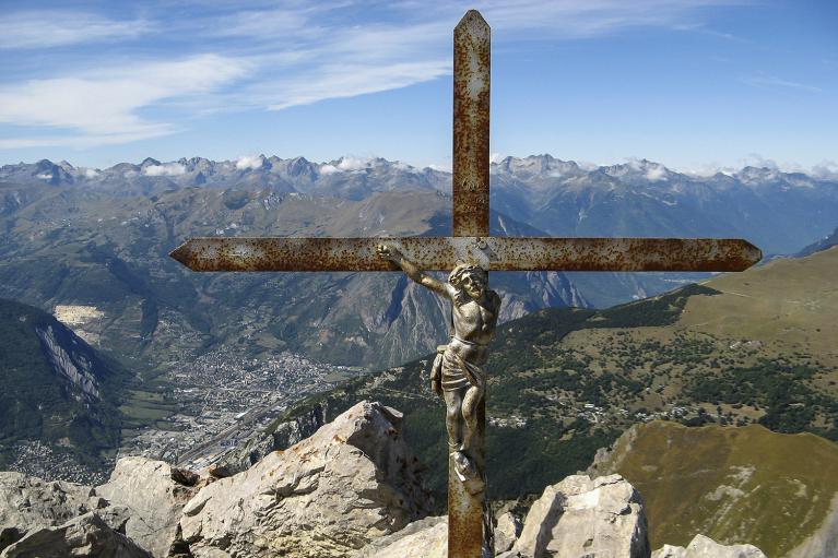 Plus que quelques mètres et on y est. Le sommet avec la croix (si j'osais je dirais que les bras m'en tombent); Tout en bas St Jean de Maurienne, à l'arrière plan le massif de Belledonne.