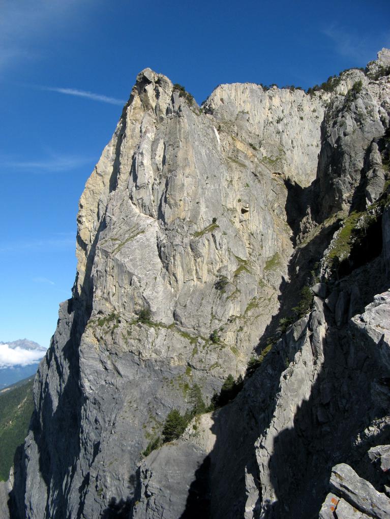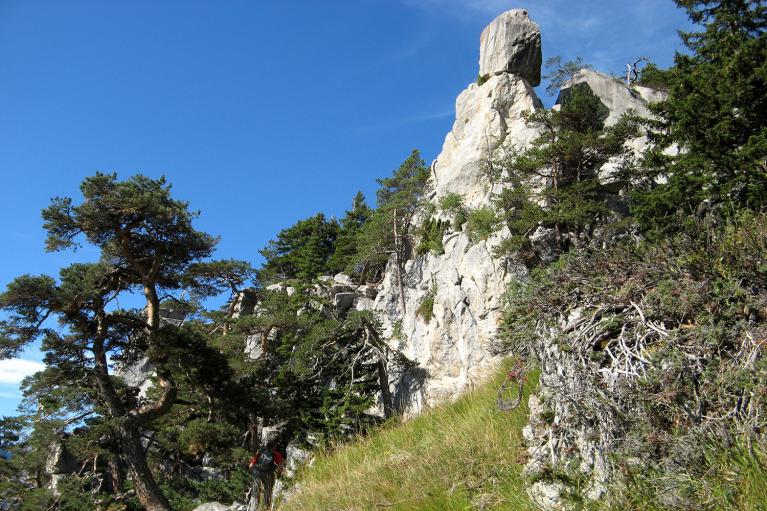 Que ne faut-il pas faire pour ramener un panorama digne de ce nom, enfin tout ceci pour dire que peu après le pin Brûlé, vous remarquerez ce promontoire et en vous tournant franchement, la photo de droite vous montre le premier couloir à gravir. Monter en direction du sommet en suivant le petit sentier au départ (à peine visible) dans cette raide portion. Ne pas aller jusqu'au sommet de ce couloir mais, sortir par la gauche de celui-ci, puis par des vires ascendantes et exposées on arrive à une petite dalle (escalade). Au sommet de cette dalle se trouve le "tut tut". Le passage est vite franchi, quelques mètres seulement et vous êtes dans un deuxième couloir pierreux qui monte vers un passage bien incliné. Traverser en montant vers la gauche sur les dalles calcaires (schistes). Après les schistes, on arrive au pied de la première mamelle que l'ont gravit par un couloir herbeux et rocheux. On atteint facilement le sommet sud de la Croix des Têtes et la plupart des randonneurs s'arrêteront là car la suite est plus dangereuse et exposée. Ensuite, chercher un passage, que nous avons trouvé à l'opposé de notre arrivée sur cette première mamelle, juste en face du but final, descendre en désescalade jusqu'à la jointure des deux mamelles et continuer par la gauche où l'on arrive à repérer un endroit à escalader. Le sommet est tout proche, mais d'un accès nettement moins facile (une corde serait même nécessaire), compter entre un quart d'heure et une demi heure pour être au bout de vos peines.