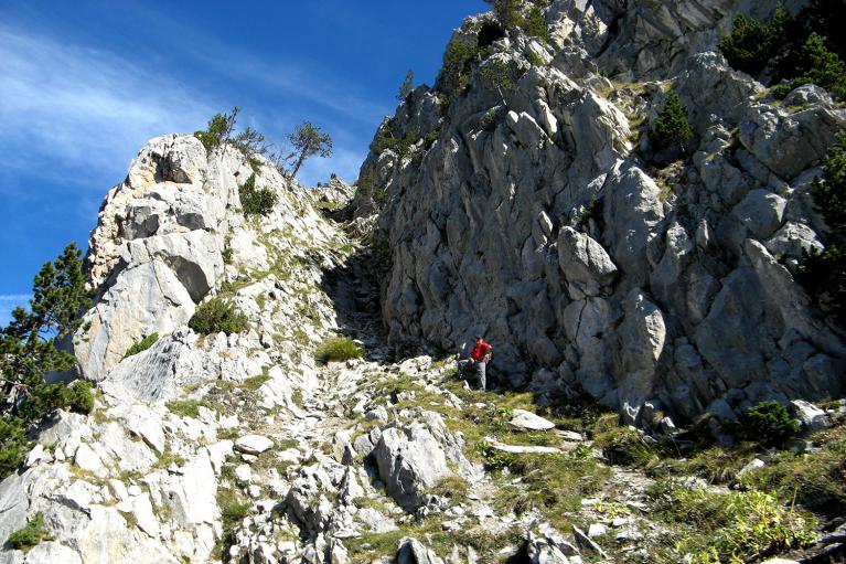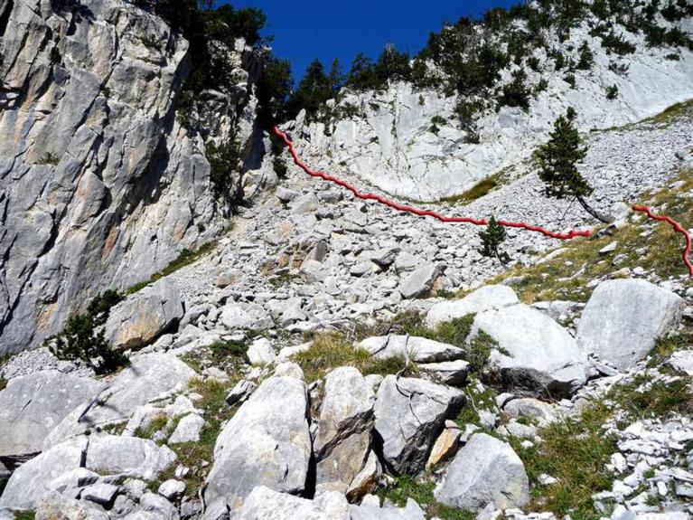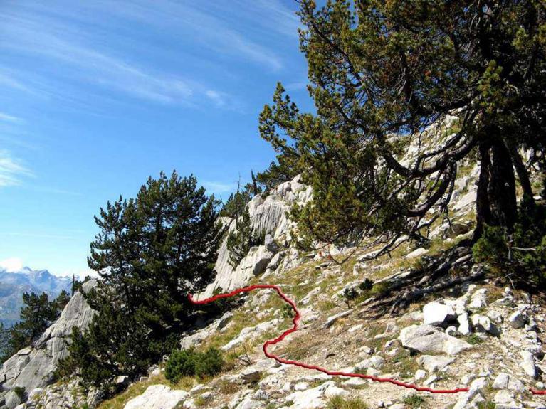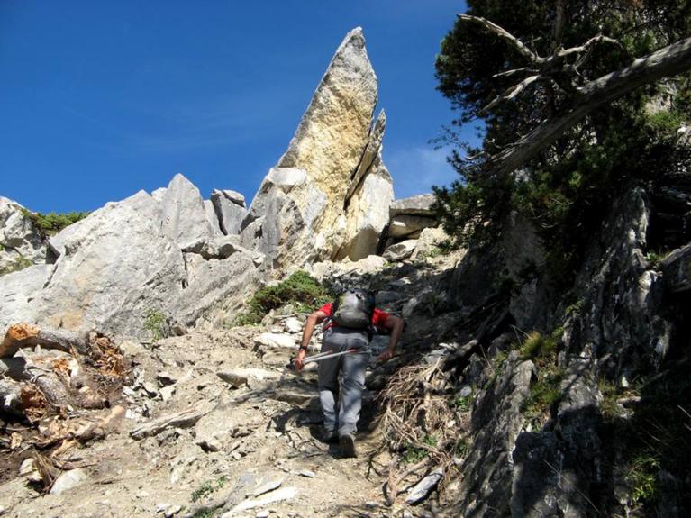 On entre dans une partie calcaire Vers 2000 m, continuer à monter le sentier qui vire à gauche (photo ci-dessous) dans un couloir pierreux. Celui-ci amène sur l'arête où se situe le pin brûlé et, comme je le disais, vous pouvez laisser vos bâtons dans le coin, car ils risquent de vous gêner dans votre progression.