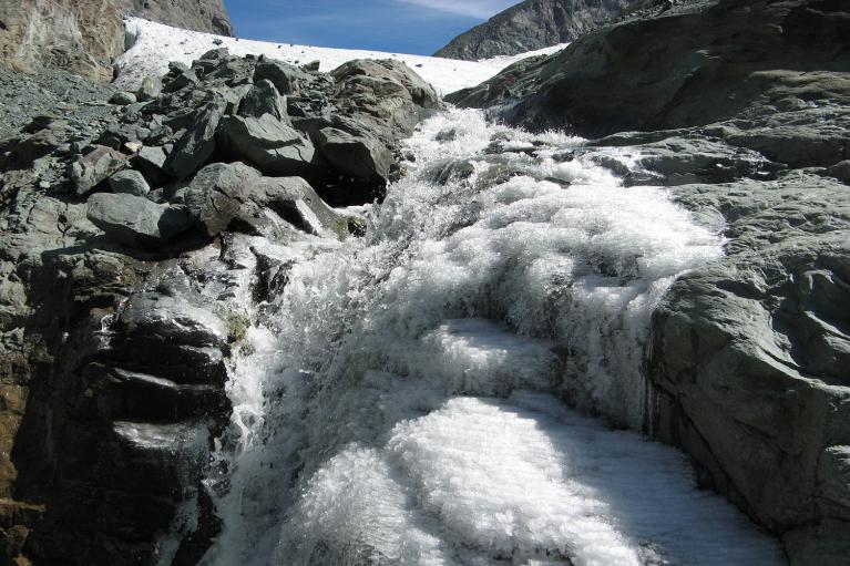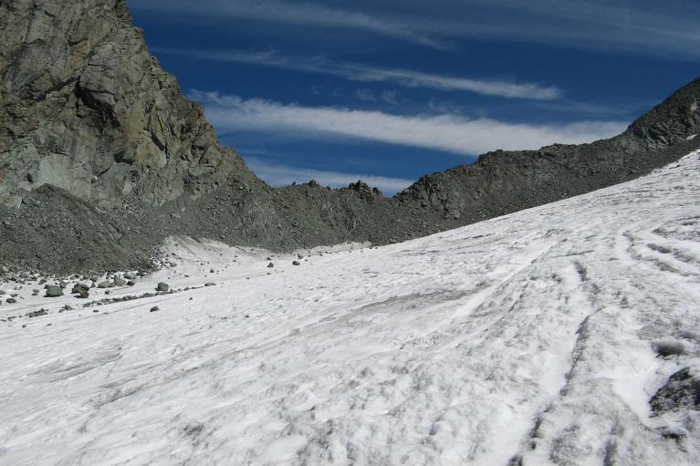 Après avoir passé un ou deux passages délicats où il faut franchir un chaos de blocs et même passer sous certains, nous voici arrivés au glacier situé dans un endroit sauvage et qui se trouve être un des glaciers à atteindre le plus rapidement à la marche parmi ceux situés dans la vallée de haute Maurienne.