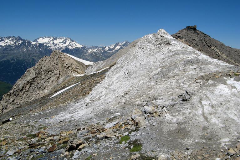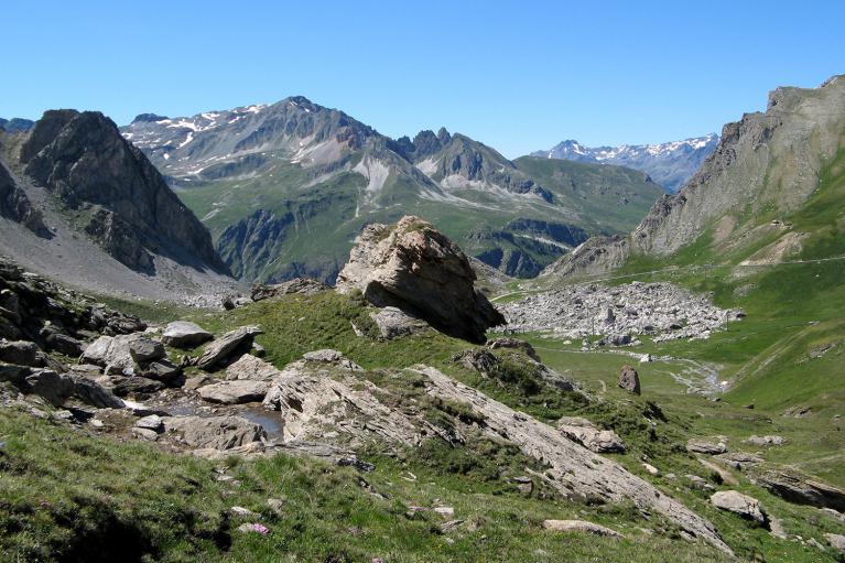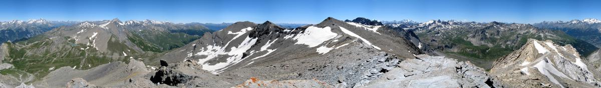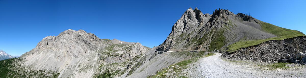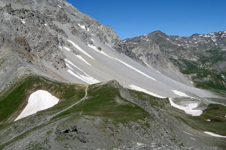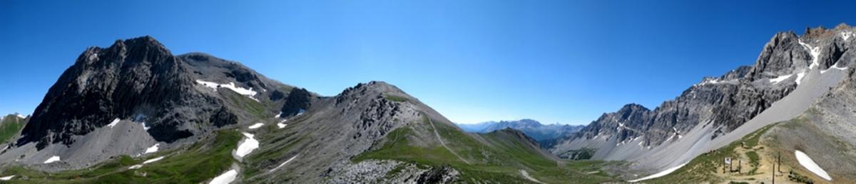 Du col, face au sentier qui mène a Bardonnechia, avec à gauche le Grand Argentier (ne pas prendre le sentier du Petit col de la Roue que l'on aperçoit immédiatement depuis le col, mais suivre un moment celui qui le contourne) et à droite vue sur la cime de Planette et les pointes Balthazar, Melchior, Gaspard.