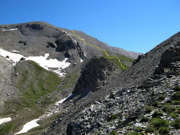 Dès que vous avez passé le petit col de la Roue, suivre le sentier sur votre gauche pour vous diriger immédiatement face à la montée. Sur la vue suivante j'ai tracé un repère jaune pour guide.
