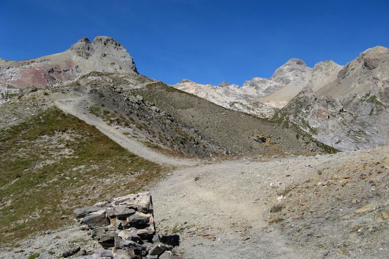 Col de la Ponsonnière avec à gauche, le sentier qui mène au lac des Cerces et à Plan Lachat, et le pano propose une vue du secteur traversé pour arriver jusqu'ici.