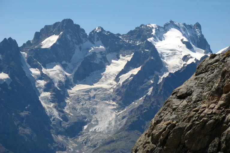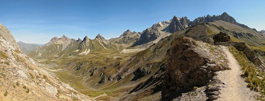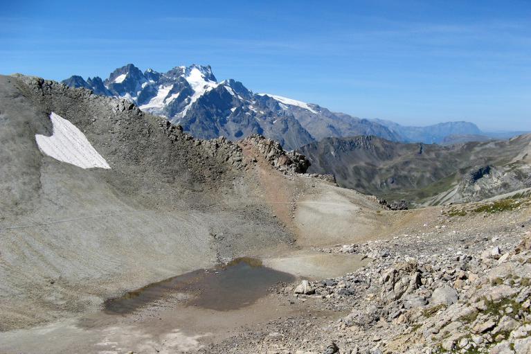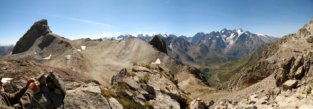 Après avoir passé le col Termier, face au roc du même nom, avec en arrière-plan les Ecrins, la Meije, le col du Lautaret.