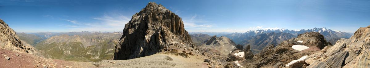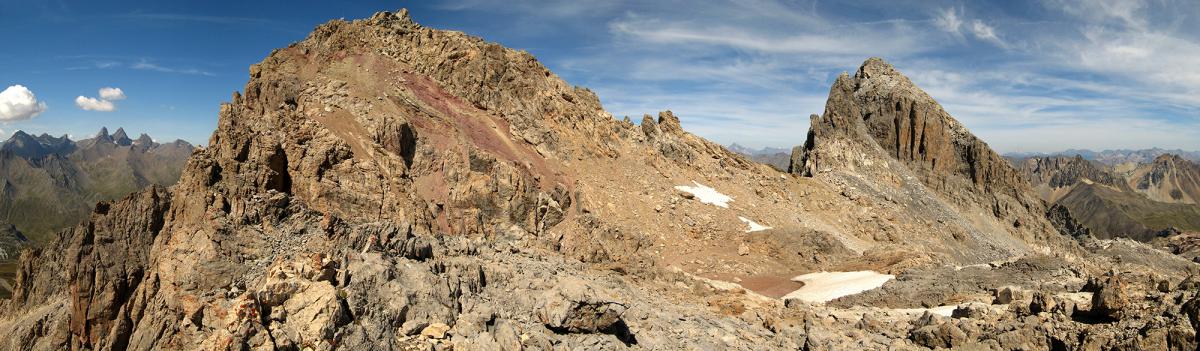 Après avoir pris une bonne suée, c'est l'arrivée entre les deux sommets. Une petite pause s'impose et l'appareil photo remplit sa tâche, ne pas oublier d'amener un jeu de piles de rechange, ce serait vraiment trop dommage de redescendre en bougonnant (j'ai connu ça). En plein centre du panorama, le sommet Est dans toute sa splendeur.