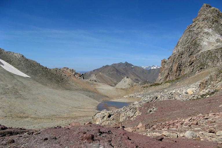 Après avoir passé la première petite rampe, on arrive au dessus du Lac Blanc que l'on peut voir sur le pano ci-dessus. Peu de temps après, une montée assez raide serpente à travers les rochers sur un bon sentier. Passé ce raidillon, on arrive au col Termier, photo de droite.