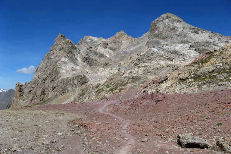 A partir du col, ne pas prendre à droite, sinon on arrive dans les barres rocheuses et l'on cherche sans arrêt un passage, donc suivre le sentier à gauche du petit lac et il vous amènera directement au pied de la montée. Là, on prend son temps face à cette impressionnante rampe, en suivant le sentier qui zigzague jusqu'à l'altitude 3121 m et ensuite le passage qui existe afin de rejoindre le sommet Ouest se situe entre les deux sommets. A partir de ce moment, les mains sont aussi sollicitées que les jambes, et en cherchant bien, on trouve ce passage qui va nous mener au but final. La récompense que l'on attend, et l'on n'est pas déçu comme vous allez pouvoir le constater avec les photos qui vont suivre.