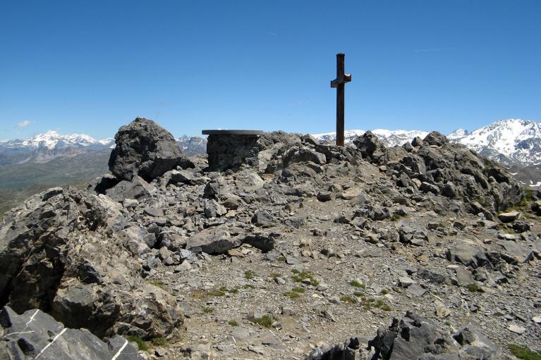 Au sommet, vue sur le massif de la Croix des Têtes, St Michel de Maurienne et le massif des Cerces à l'arrière-plan.