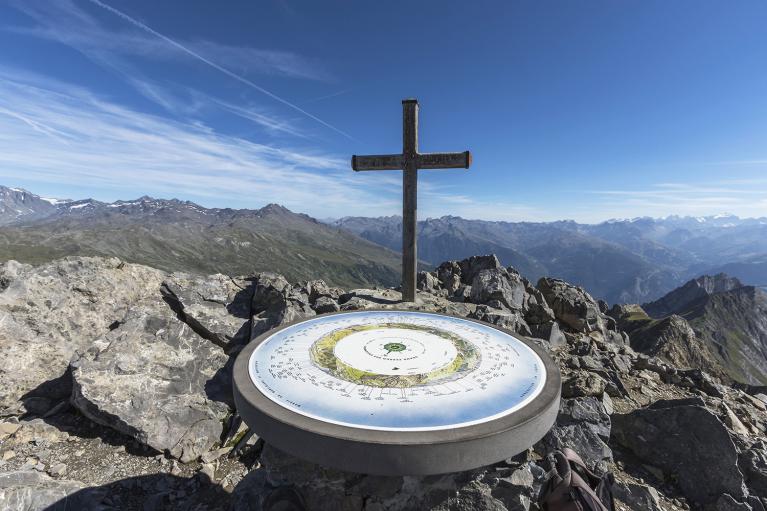 Imaginez-vous au centre d'un gigantesque cercle et votre regard se portera aussi loin que la qualité de vos yeux vous le permettent. La table d'orientation que vous pouvez voir ci-contre est très utile pour nommer précisément tous les sommets qui nous entourent.