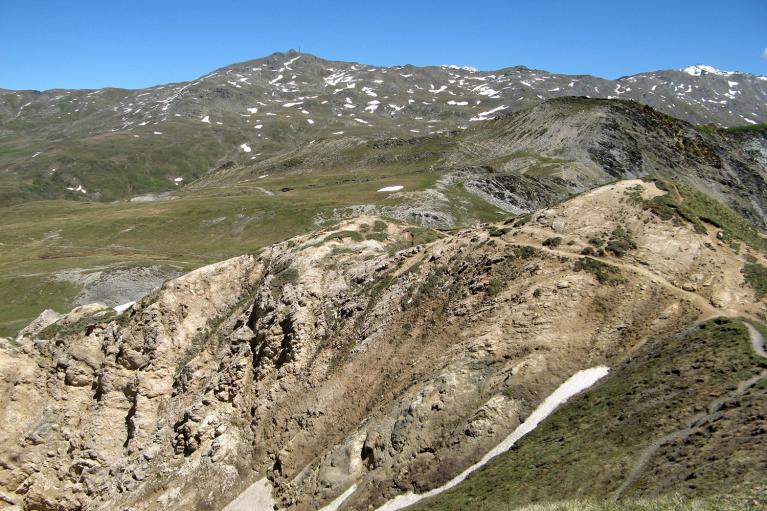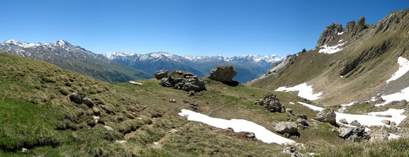 Le Petit Perron, profitez d'une pause avant le gros morceau pour contempler le versant opposé avec, au premier plan le village de Mont Denis, derrière la ligne de crête, se trouve Saint Jean de Maurienne que lon ne voit pas (juste pour situer) et toujours dans le même alignement, les stations du Corbier et de la Toussuire. A l'arrière plan, la partie la plus enneigée, le pic de l'Etendard (3464 m.), Grand Pic de Belledonne, l'Aiguille de l'Argentière...etc