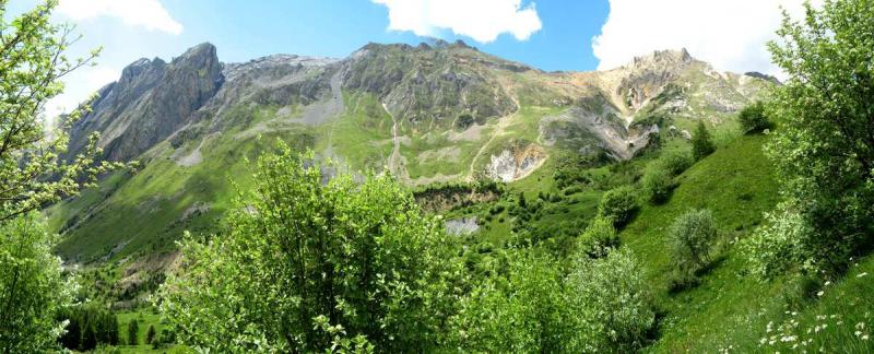Le petit panorama représente la vue que l'on a lorsque l'on suit la piste qui mène aux Rateaux. De la Planchette jusqu'au parking du hameau, comptez environ dix minutes en roulant doucement, car cette piste comporte quelques passages délicats mais franchissables. Pendant le début de la montée, vous aurez à votre gauche le massif de la Croix des Têtes, avec sur la photo de droite une vue sur le col du Bonhomme (voir autre page)
