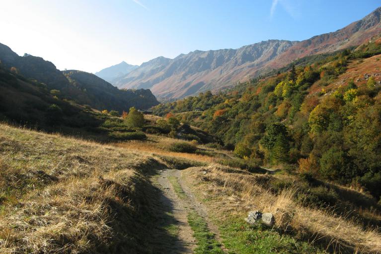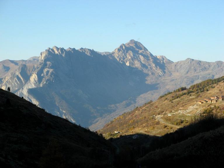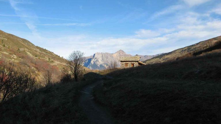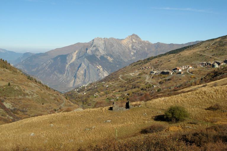 Sur le sentier balcon avec vue sur une partie de Valmeinier 1800 et la cernière photo sur le massif de la Croix des Têtes et le Grand Perron des Encombres.