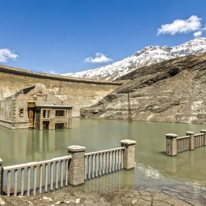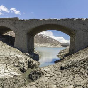 Il me fallait ne pas rater l'occasion de le voir en l'état et le 17 mai 2106, le col étant accessible aux véhicules, j'en ai profité pour aller visiter ces anciens bâtiments, barrages, digues, blockaus, ponts, invisibles lorsque le lac est à son niveau normal; balade qui m'a quand même pris quelques heures pour en faire le tour, ce qui m'a fait sourire en pensant que c'était bien la première fois que je faisais une randonnée au fond d'un lac.