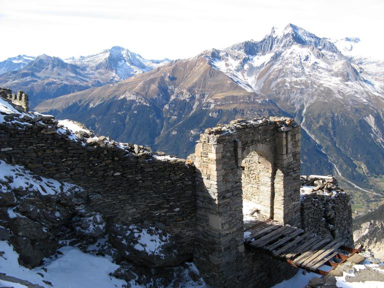 Le Mont Froid est maintenant atteint et avant de s'attarder sur les ruines et leur histoire sanglante, nous sommes saisis par le panorama offert où la vue porte très loin sur la vallée de la Maurienne, au delà de Modane, puis sur les sommets du parc de la Vanoise, avec entre autres; le Rateau d'Aussois, la Dent Parrachée, les glaciers de la Vanoise, la grande Casse etc...car c'est un 360° magnifique (comme toujours).