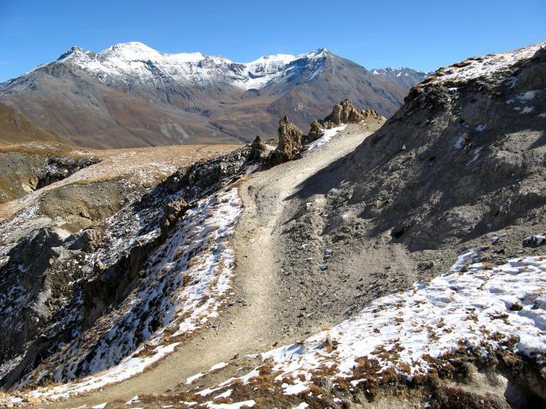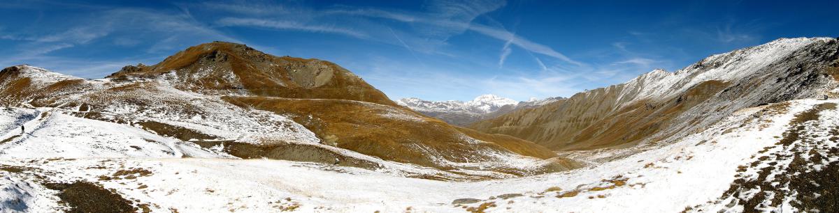 Le col de Sollières est déjà en vue et l'on continue d'avancer dans ce paysage partiellement recouvert de neige fraîche, Nous sommes en octobre au moment de la ballade et les sommets commencent tout doucement à se recouvrir.