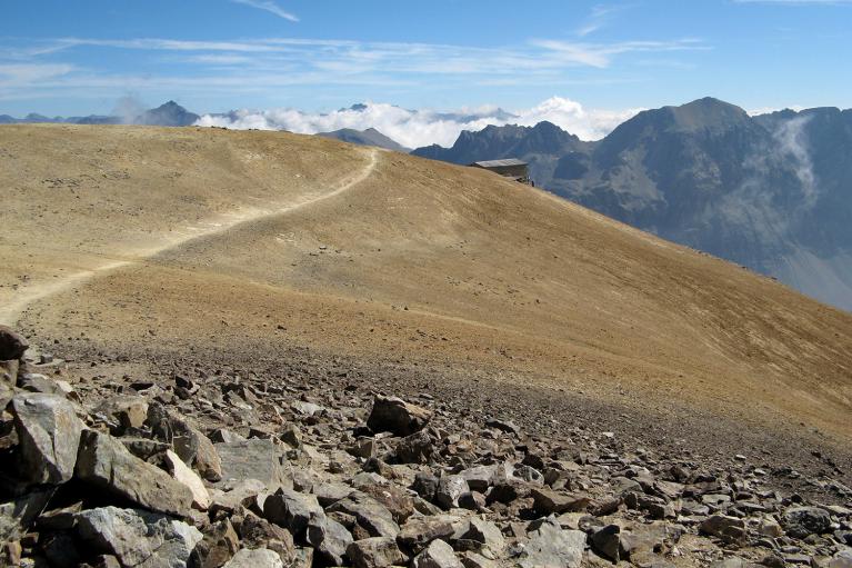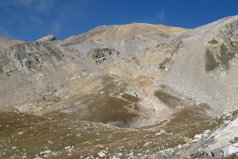 Changement de décor, car l'herbe disparaît pour laisser place à des paysages plus minéraux. Le sentier, large et facile est parsemé de cairns jusqu'aux pentes arides, terreuses et caillouteuses du sommet; c'est la montée du calvaire qui porte assez bien son nom. Un peu avant le sommet, on arrive à la chapelle du Mont Thabor.