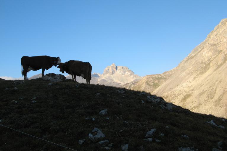 Grâce à un départ matinal (7h30), la première partie de la montée se fait en traversanr un paysage superbe, rehaussé par les couleurs de ce moment de la journée; avec ces deux vaches qui admirent le Cheval Blanc tout au fond; à Replanette, avec vue sur la pointe des Sarrasins et enfin le terme de cette première partie, le col de Vallée Étroite.