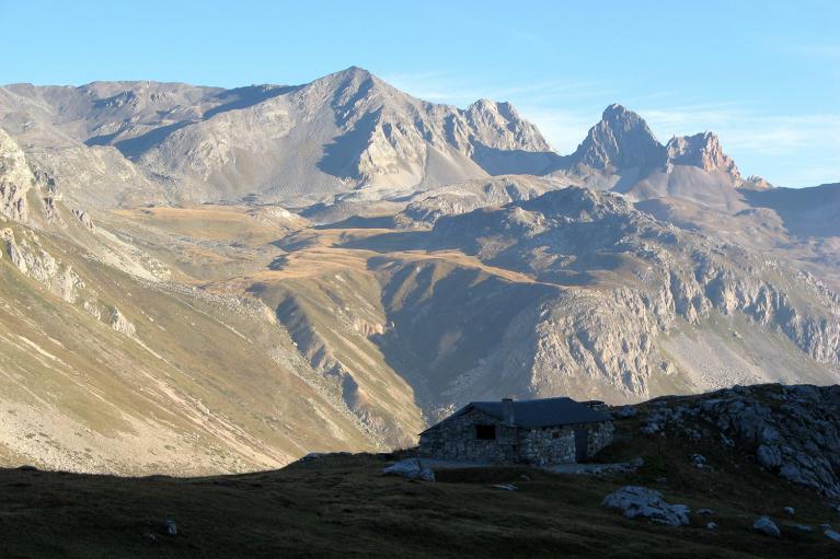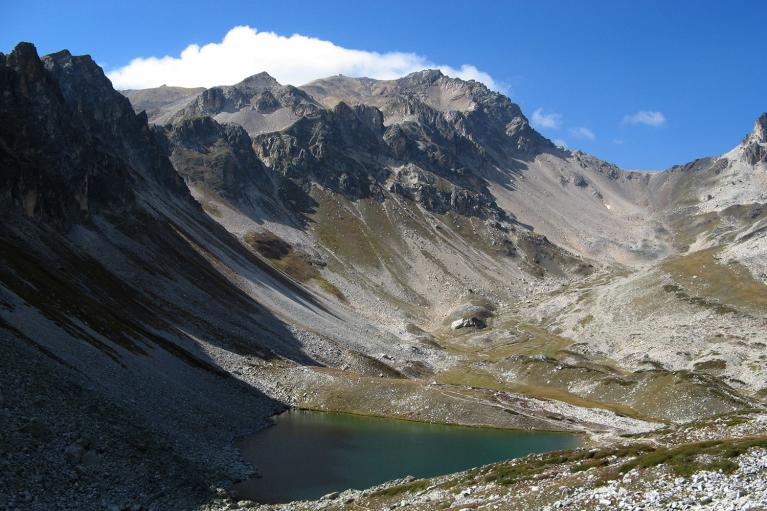Vous arriverez par le sentier de gauche et celui que l'on distingue à droite mène à Valmeinier ou au refuge des Drayères, car les accès à ce secteur sont nombreux et variés.