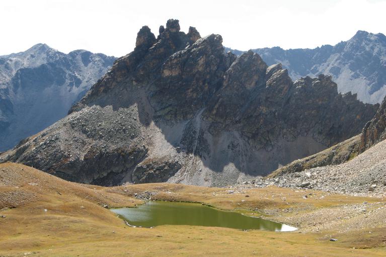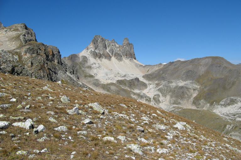 Le sentier contourne le lac par la gauche et amorce sa rude montée en arc de cercle vers la droite qui permet de passer au dessus de la barre rocheuse qui domine le lac. A hauteur du Grand Séru qui se trouve à gauche, un tronçon moins pentu, serpentant entre les rochers, débouche au Col des Méandes (2727m).