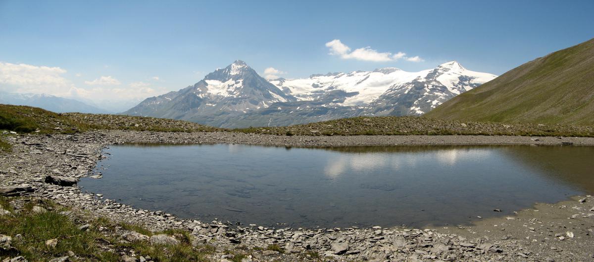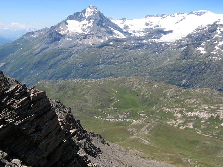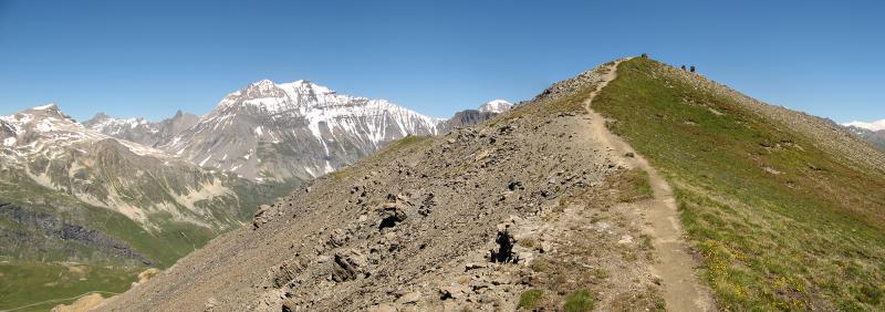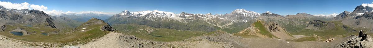 Sous le col de Lanserlia, face à la dent Parrachée, les glaciers de la Vanoise, dôme de l'Arpont et dôme de Chasseforêt.