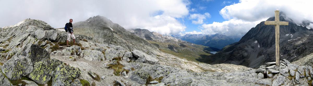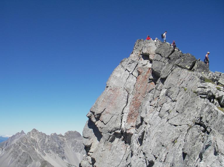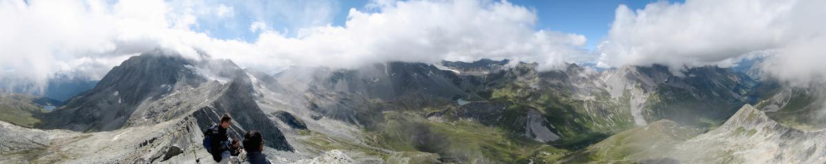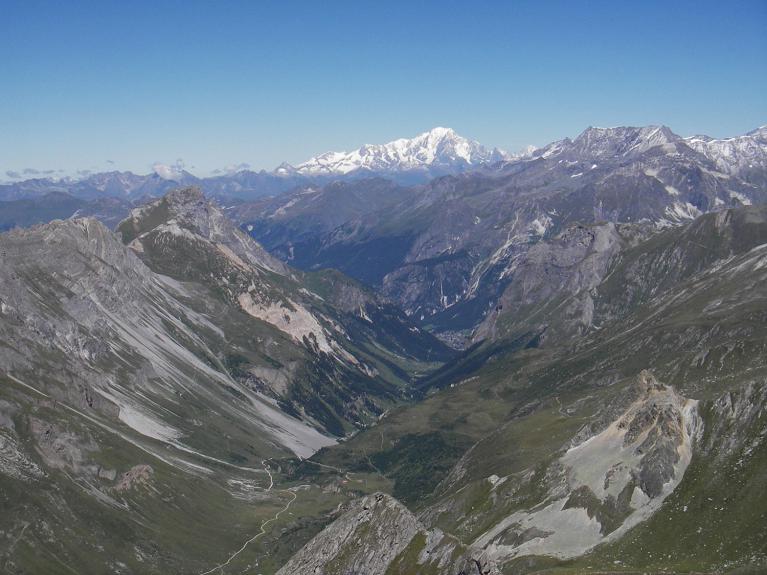 Quelle vue ! Il arrive que l'on soit obligé d'attendre son tour pour jouir du spectacle, car comme vous pouvez le constater sur la photo, le sommet n'est pas large, mais ce n'est pas un souci, maintenant que l'on est là et le soleil aussi, y a le temps ! On voit le sentier qui mène au col de Chavière depuis Pralognan, dans le virage que celui forme, se trouve le refuge du Roc de la Pêche et à sa gauche, le sentier qui mène au Petit Mont Blanc, au centre on peut apercevoir une partie de Pralognan la Vanoise, et le sommet enneigé au fond est tout simplement le Mont Blanc.