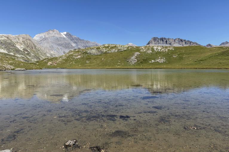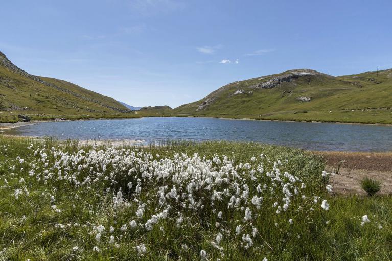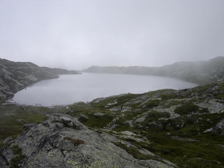 Le lac de Bellecombe, voici l'endroit idéal pour poser les sacs, se restaurer puis lézarder sous ce soleil magnifique, si aléatoire au début du parcours.
