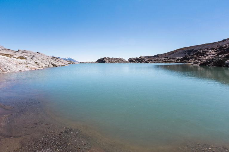 Après avoir contourné le refuge , il faudra prendre le sentier qui remonte la moraine; lui aussi a une pente qui est assez impressionnante et qui va se poursuivre une heure environ, pour tirer ensuite sur la gauche où il sera nettement moins raide. De temps en temps, le sentier se cache à la vue, mais se retrouve vite . Il débouche ensuite sur des barres rocheuses agrémentées de cairns et on arrive à droite au-dessus du lac.